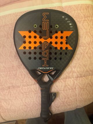 Pala de pádel Harlem Nirvana 12K del año 2024. Diseñada con un acabado en negro y detalles naranjas. - Marco con acabado 12K. - Diseño con forma de X en naranja. - Modelo Nirvana 2024. buen estado, tan solo un poco levantada la pintura en un lado pero solo pintura nada más. va con overgrip nuevo y protector