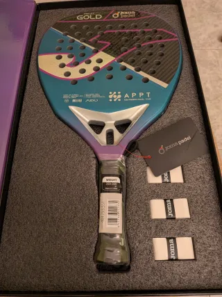 Pala de pádel Joma Gold APPT con un diseño moderno y llamativo. - Pala de pádel Joma. - Modelo Gold APPT. - Incluye 3 overgrips Joma.