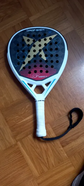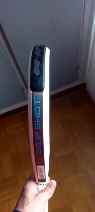 Pala de pádel Drop Shot con diseño moderno. - Esta como nueva, tiene 30 minutos de uso. - Color blanco con detalles en negro, dorado y rojo. - Logo de Drop Shot en la cara. - Grip blanco.