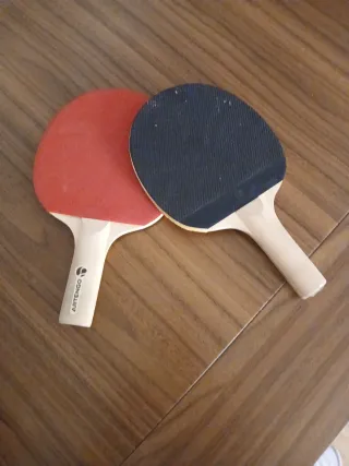Se venden dos palas de ping pong de la marca Artengo. Una pala es de color negro y la otra es de color rojo. - Pala de ping pong negra. - Pala de ping pong roja. - Marca Artengo.