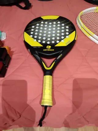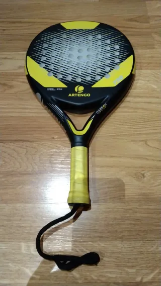 Pala de pádel Artengo con acabado en negro y detalles amarillos. Usada un día, está prácticamente sin estrenar. 36 mm - Marco de carbono. - Superficie de fibra de vidrio. - Empuñadura amarilla. - Incluye cordón de seguridad negro.