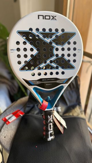 Pala de pádel Nox Equation Soft Advance. - Diseño moderno en blanco y azul. - Acabado mate. Pala nueva a estrenar con etiquetas y 6 meses de garantia