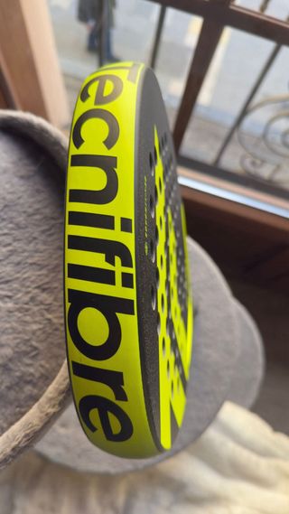 Pala de pádel Tecnfibre Bomba Lite en color negro y amarillo. - Diseño con logo 'F' en amarillo. - Agarre negro. - Correa de muñeca con logo Tecnfibre. Pala nueva a estrenar con etiquetas y 6 meses de garantia