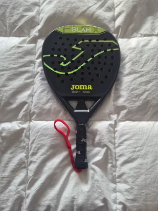 Pala de pádel Joma Slam X en color negro y verde lima. Diseño moderno y deportivo. - Pala de pádel Joma. - Modelo Slam X. - Color negro con detalles en verde lima. - Incluye cordón de seguridad rojo.