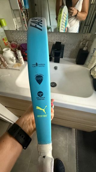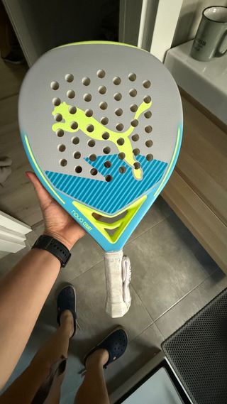 Pala de pádel Puma Nova Court con un diseño moderno y llamativo. 2 palas precio unidad. - Pala de pádel. - Marca: Puma. - Modelo: Nova Court. - Color principal: Gris. - Detalles en amarillo neón y azul.