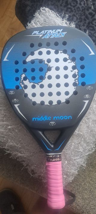 Pala de pádel Middle Moon modelo Platinum Attack. Diseño moderno y llamativo. - Pala de pádel Middle Moon - Modelo Platinum Attack - Diseño con detalles en azul y blanco - Empuñadura rosa