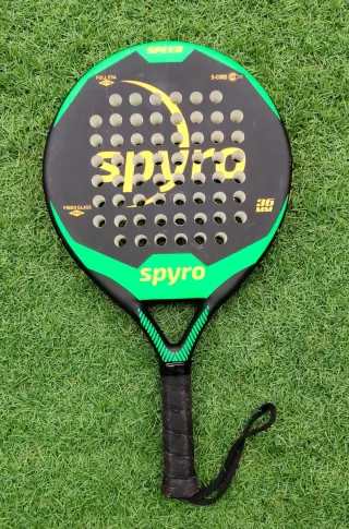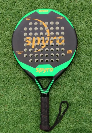 Pala de pádel Spyro con un grosor de 36mm. Diseñada con un acabado en negro y detalles en verde. -No tuvo apenas uso. - Incluye correa de seguridad. -REGALO 3 PELOTAS sin uso.