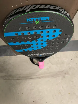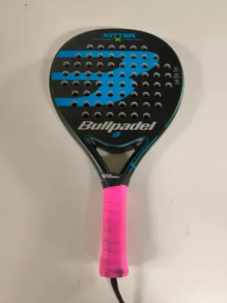 Pala de pádel Bullpadel Kiter X1 con un diseño moderno en negro y azul. - Superficie con agujeros. - Grip de color rosa. - Logo de Bullpadel en el centro.