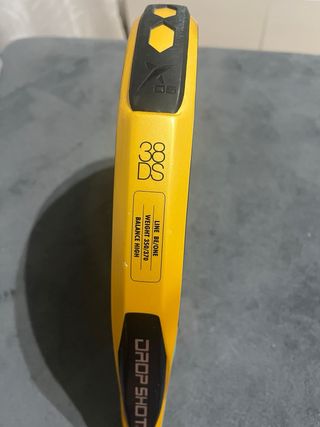 Pala de pádel Drop Shot Axion con diseño moderno. - Color negro, amarillo y detalles en turquesa. - Incluye correa de muñeca con el logo Drop Shot. - Hexacore en la empuñadura incluido