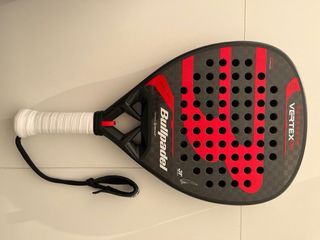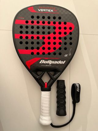 Pala de pádel Bullpadel Vertex 04, modelo de Juan Tello. Es un regalo de febrero de 2025. He jugado con ella 5-6 partidos y no me he acostumbrado. Está prácticamente nueva. Sólo tiene pequeñas marcas, que se muestran en las fotos, y que afectan exclusivamente a la pintura. Se entrega también el Hexacore que traía. Pesa 362 g incluyendo la correa. No es negociable.
