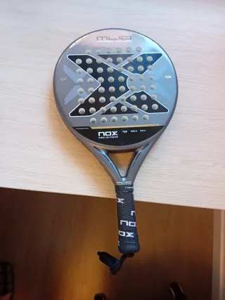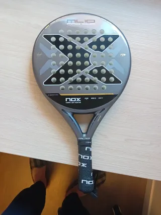 Pala de pádel NOX ML10 Shotgun Luxury Series en perfecto estado. Muy potente y muy manejable. - Carbono 12K y corazón HR3 Core. - Sistema de antivibración AVS - Color negro, con detalles en rojo y plata. - Superficie rugosa con panel de hexágonos para mayor control. - La empuñadura tiene instalado el sistema de Nox Custom Grip. - Tapón con sistema intercambiable para cuerda negra y cordón de seguridad rojo y negro. Ambos los originales de Nox. - Lleva un protector transparente de Nox, puesto desde nada más ser comprada la pala