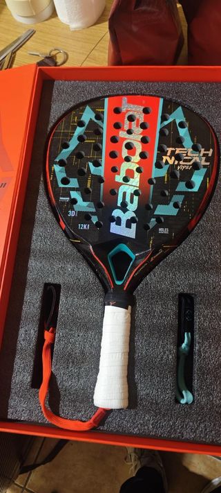 Pala de pádel Babolat Viper, modelo Juan Lebrón. - Diseño con detalles en negro, rojo y turquesa. - Logo de Babolat en el centro. - Cuerda de seguridad naranja. - Grip blanco.