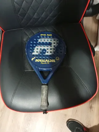 Pala de pádel Royal Pádel modelo RP110 PLUS. - Pala de pádel azul. - Logo de Royal Pádel en blanco y plateado. - Grip gris desgastado.
