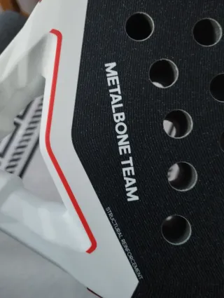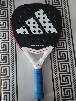 Pala de pádel Adidas Metalbone Team con diseño moderno. - Superficie negra con detalles blancos y rojos. - Logo de Adidas en blanco. - Nombre 'METALBONE TEAM' visible. - Empuñadura azul.