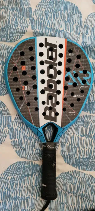 Pala de pádel Babolat con un diseño moderno y llamativo. - Color azul y negro. - Logo de Babolat en blanco. - Agarre negro.