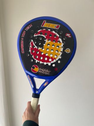 Pala de pádel Middle Moon modelo Iberica. - Marco de carbono 100%. - Grosor de 38 mm. - Diseño con la bandera de España.