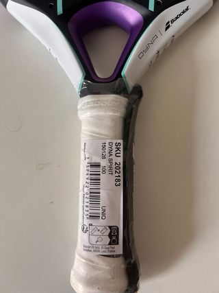 Pala de pádel Babolat Dyna Spirit con diseño moderno. - Color principal negro con detalles en turquesa y morado. - Logo de Babolat en blanco. - Agarre blanco con plástico protector.