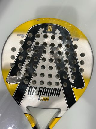 Pala de pádel MEGAMAX en color plateado y amarillo, con diseño deportivo. hay que ponerle una cinta de agarre, por eso el precio de 10€ - Incluye funda para su transporte y protección.