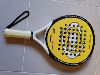 Pala de pádel Vision en color amarillo con detalles en negro y blanco. Fabricada con carbono. - Peso: 380 gramos. - Material del marco: Carbono. - Diseño con agujeros característicos.