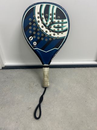 Pala de pádel con un diseño moderno en tonos azules y blancos. Incluye una cuerda de seguridad. - Diseño con rayas y detalles curvos. - Agarre blanco con cuerda negra. - Agujeros en la superficie de golpeo.