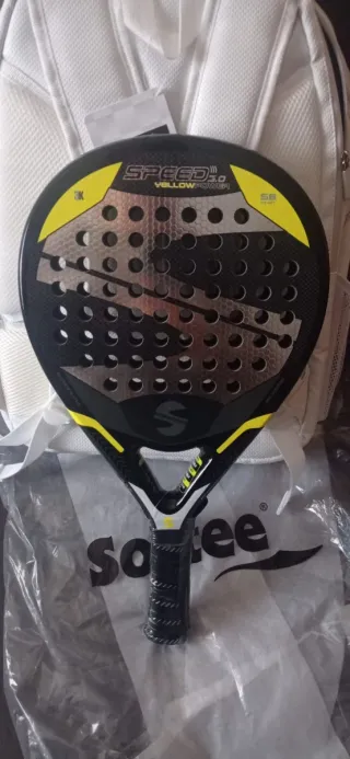 Se vende pala de pádel Softee junto con una mochila nueva a estrenar. - Pala de pádel negra con detalles amarillos. - Mochila blanca. Ocasión regalo de navidad y reyes