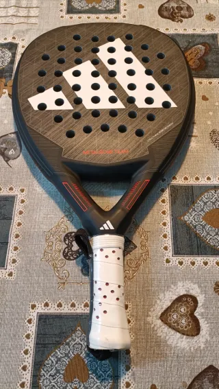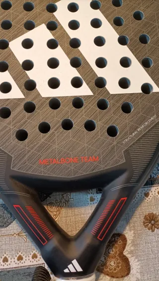 Pala de pádel Adidas Metalbone Team con un diseño moderno y deportivo. Ideal para jugadores que buscan control y potencia en cada golpe. - Pala de pádel Adidas. - Modelo: Metalbone Team. - Color: Negro con detalles en rojo y blanco. - Logo de Adidas en el centro. - Empuñadura blanca con puntos rojos. Vale 200 A ESTRENAR