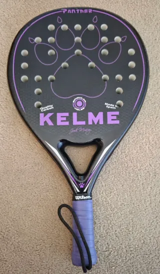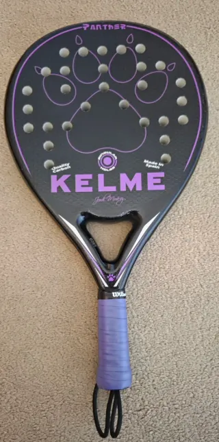 Pala de pádel Kelme Panther con diseño llamativo. - Pala de pádel negra con detalles en morado. - Diseño de huella de pantera en la cara. - Agarre morado. - Fabricada en España.