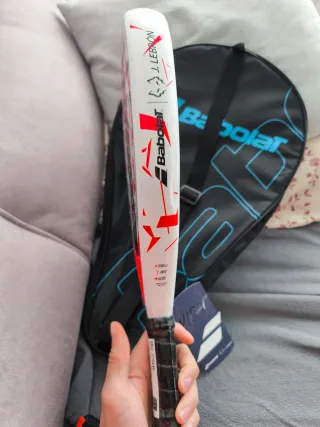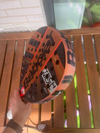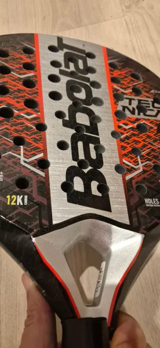 Sufre un rozón bajo la protección. Se ve en mas fotos. Funciona perfectamente. - Diseño con detalles en rojo y plateado. - Logo de Babolat en el centro. - Agarre negro. - Agujeros en la cara de la pala.