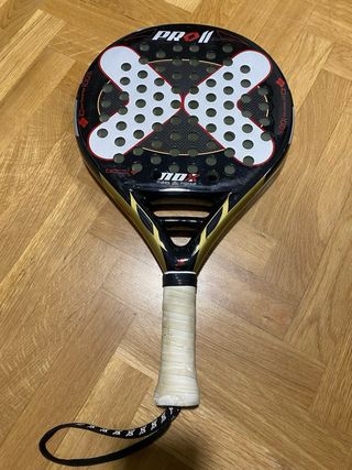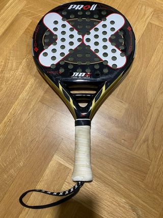 Pala de pádel Nox Pro II con diseño moderno y llamativo. - Pala de pádel Nox Pro II. - Pala de carbono 100%. - Diseño con acabado en negro y detalles dorados. - Incluye cordón de seguridad.