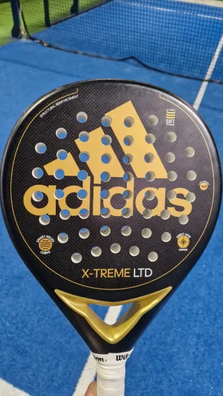 Pala de pádel Adidas X-Treme LTD en color negro con detalles dorados. Diseñada para un juego potente y preciso. - Logo de Adidas en dorado. - Modelo X-Treme LTD. - Agarre blanco con cordón de seguridad negro. Pala en muy buen estado