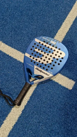 Pala de pádel Bullpadel modelo Ionic PWR. - Color azul con detalles plateados. - Diseño con agujeros característicos. - Incluye correa de seguridad negra. Excelente pala con un juego y potencia bárbaro Desgaste mínimos del uso