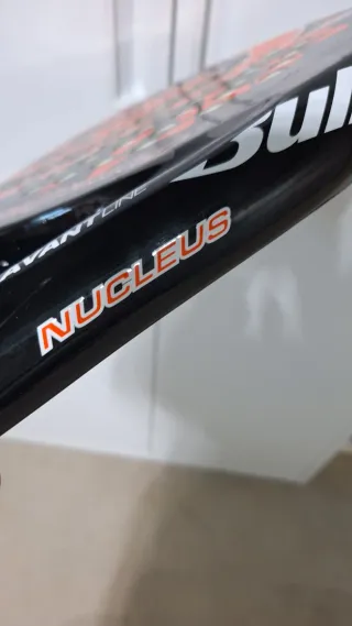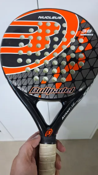 Pala de pádel Bullpadel Nucleus con un balance de 38. - Diseño en negro, naranja y gris. - Marco negro brillante. - Logo de Bullpadel en la cara. - Nombre 'NUCLEUS' en la parte superior. - Indicación '38 BALANCE' en la cara. Pocos uso únicamente los roces que se ven, incluye funda. Pala de control.