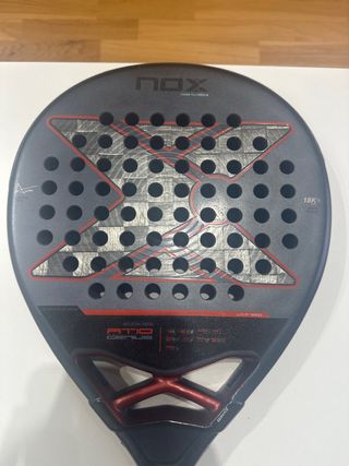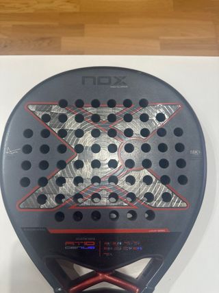 Pala de pádel NOX AT10 Attack 12K, diseñada en España. Modelo de Agustín Tapia. Apenas 3-4 partidos, sin golpes y siempre con protector, la vendo porque tengo varias y está apenas la uso.. - Acabado en carbono 12K. - Forma diamante - Incluye funda original de Nox - Incluye protector y los grips rojos originales de nox Regalo 4 overgrips nuevos naranja