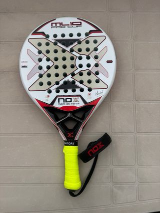 Pala de pádel NOX ML10 Pro Cup, modelo de Miguel Lamperti. - Diseño en blanco con detalles en rojo y negro. - Superficie con agujeros. - Empuñadura amarilla. - Incluye funda negra con logo NOX.