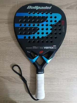 Pala de pádel Bullpadel Vertex L. - Diseño en negro con detalles en azul. - Logo de Bullpadel en grande en el centro. - Modelo Vertex 02. - Grip blanco.