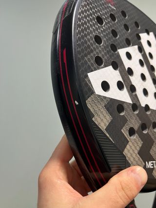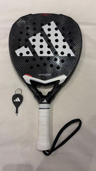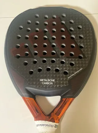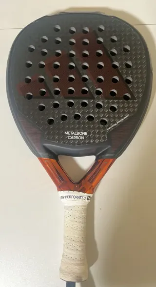 Pala de pádel Adidas Metalbone Carbon con acabado en carbono. - Diseño con logo Adidas. - Superficie con textura. - Mango con grip. - Incluye cordón de seguridad. Está SIN usar, lleva un golpe en el extremo, llegó a si y se me pasó el plazo de devolución.
