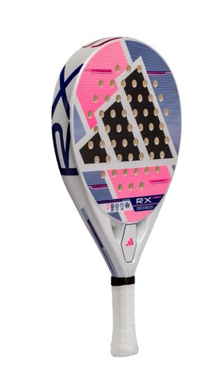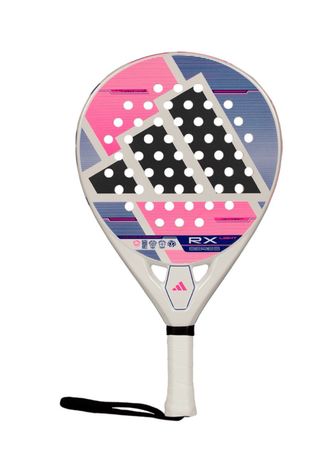 Pala de pádel Adidas RX Series Light con un diseño moderno y llamativo. - Diseño en blanco, rosa y azul. - Logo de Adidas en la pala y el puño. - Incluye correa de seguridad negra.