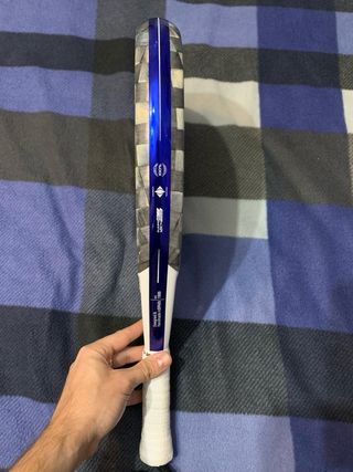 Pala de pádel Sane Agressor VII con un diseño moderno y llamativo. - Pala de pádel Sane. - Modelo Agressor VII. - Diseño con detalles en azul y plateado. - Pala utilizada dos veces.