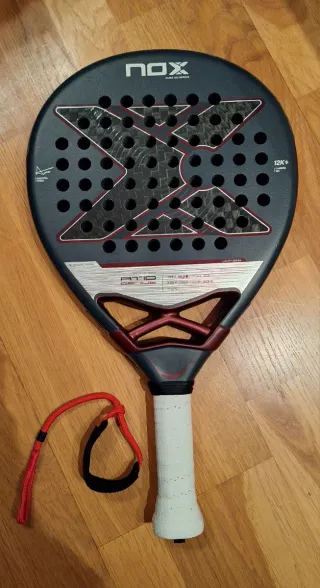 No me adapto a ella pala con poco uso, compré dos igual y no me gustan pala con menos de 8 partidos. Lleva protector transparente bien pegado. Pala de pádel Nox AT10 12K del año 2025. Diseñada para un juego versátil y potente. - Acabado en carbono 12K. - Goma Black EVA.