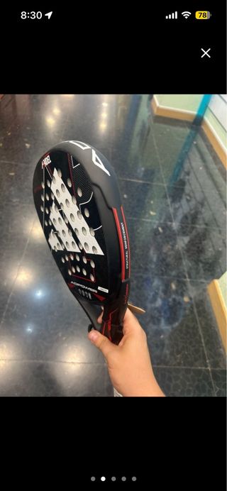 LLEVA UN PEQUEÑO DESPERFECTO DEL USO, QUE NO AFECTA AL JUEGO , AÚN ASÍ POR ESO ESTÁ A ESTE PRECIO ➡️ PRECIO NUEVA 190€ Pala de pádel Babolat Jet Technical - Diseño con acabado en carbono y detalles en rojo y negro. - Superficie con patrón de agujeros. - Empuñadura negra con cordón de seguridad.