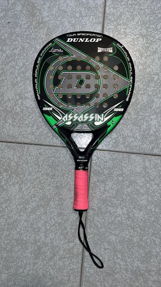 Pala de pádel Dunlop Assassin con diseño en negro y verde. - Marco de impulso máximo. - Tour Specification. - Megaflex Core. Daños puestos en las fotos, son roces, la pala va muy bien pero me han regalado otra.