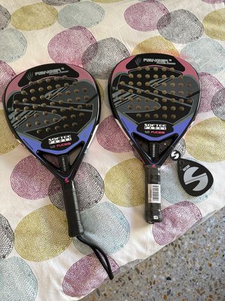 Se venden dos palas de pádel Softee Ranger 1.0. Regalo una funda y pelotas - Diseño en color fucsia y azul. - Incluye funda. - Fabricadas en España.