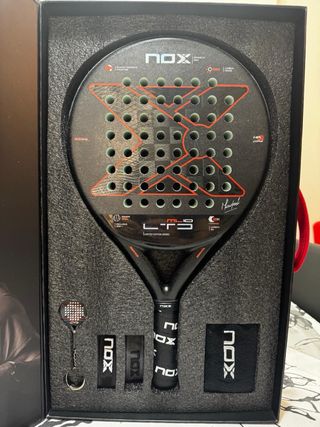 Pala de pádel NOX ML10, edición limitada de Miguel Lamperti. Incluye caja original y accesorios. - Pala de pádel. - Caja de presentación. - Llavero con forma de pala. - 2 Muñequeras -2 Smartstrap