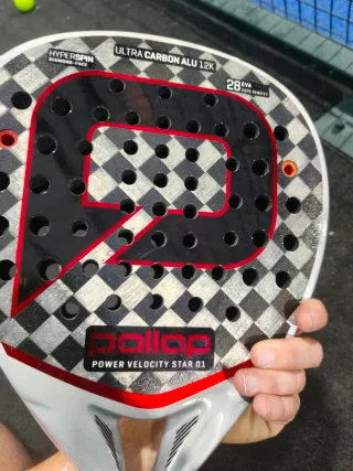 Paleta de pádel Pallap Power Velocity Star 01 con acabado de carbono y detalles en rojo. - Marco de Ultra Carbon Alu 12K. - Cara con tecnología HyperSpin Diamond Face. - Núcleo de densidad EVA 28.
