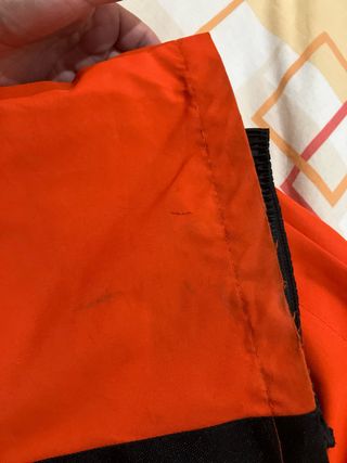 Pantalones de esquí Crivit en color naranja y negro, talla 40. - Diseño moderno y funcional. - Cremallera lateral en el bolsillo. - Paneles reforzados en la parte inferior. Tiene varias manchas sobretodo en la parte baja de las perneras. Bajo rozado y rasgado.