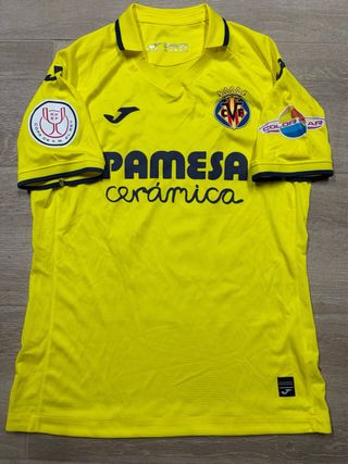 Camiseta de fútbol del Villarreal CF, modelo de jugador. - Color amarillo. - Logo de Joma bordado. - Escudo del Villarreal CF. - Patrocinador principal: Pamesa Cerámica. - Parche de la Copa de S.M. el Rey. - Manga corta.