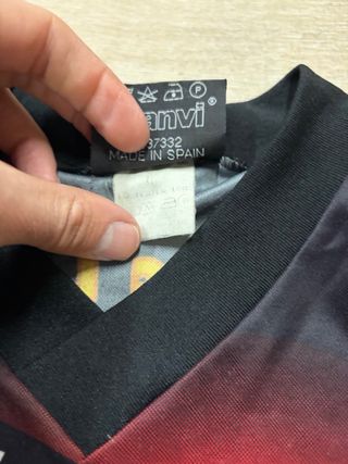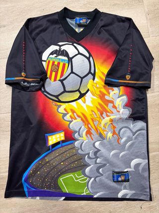 Camiseta de fútbol vintage del Valencia Club de Fútbol, marca Luanvi. Diseño llamativo con balón de fútbol en llamas y estadio. - Talla L. - Tejido ligero y transpirable. - Logo de Luanvi en la manga. - Escudo del Valencia CF en el pecho.