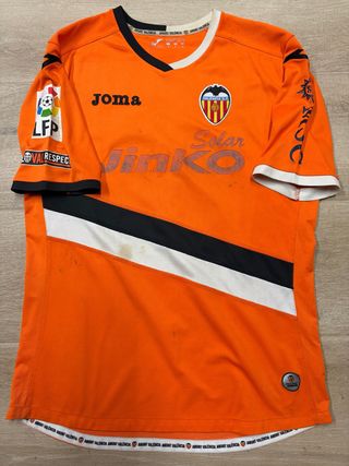 Camiseta de fútbol del Valencia C.F. de la marca Joma, utilizada en partido. - Color naranja con detalles en negro y blanco. - Logo de Joma y escudo del Valencia C.F. en el pecho. - Inscripción Amunt Valencia en el cuello y el bajo.