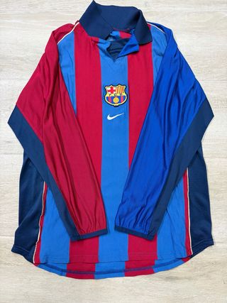 Camiseta de fútbol del FC Barcelona, modelo player match de manga larga. Diseño icónico con las franjas verticales rojas y azules. - Escudo del FC Barcelona bordado. - Logo de Nike. - Cuello tipo polo con botones.