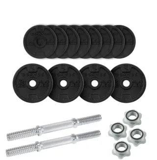 Kit de mancuernas ajustables para entrenar en casa o el gimnasio. Incluye todo lo necesario para variar el peso. - Dos barras de mancuerna. - Cuatro discos de 2 kg. - Cuatro discos de 1 kg. - Cuatro cierres de estrella.